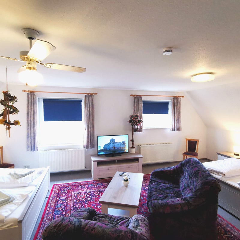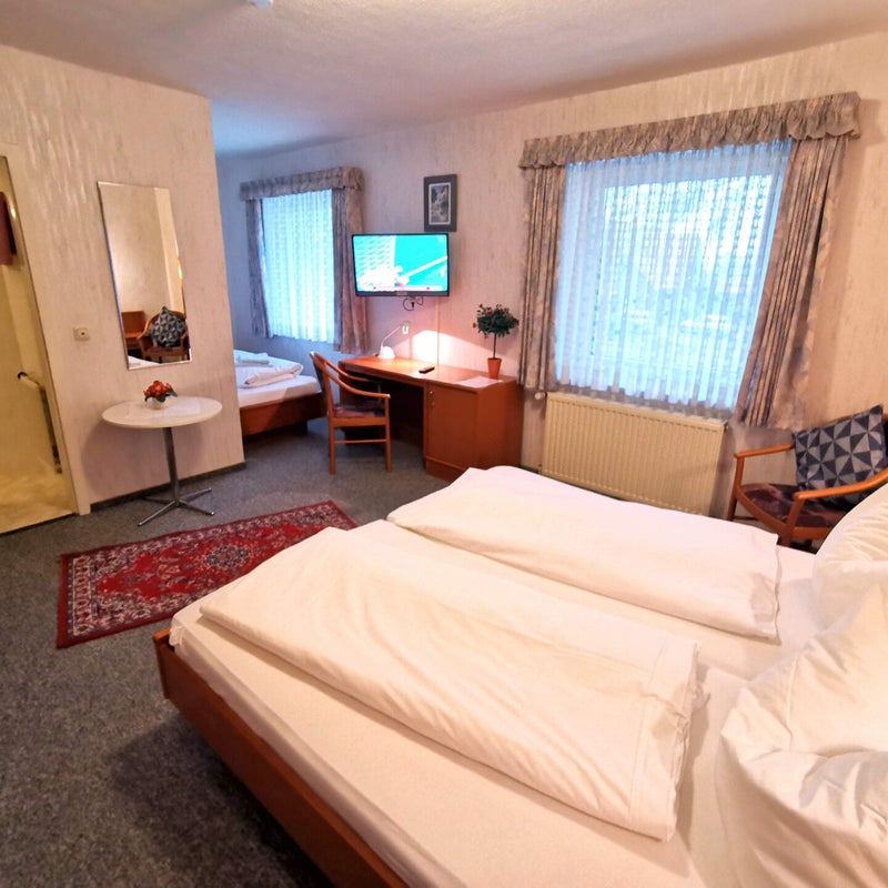 Unser gemütliches 3-Bettzimmer im Retro-Design (22 m²) vereint Komfort und Nostalgie – ideal für kleine Familien, Reisegruppen oder Freunde.